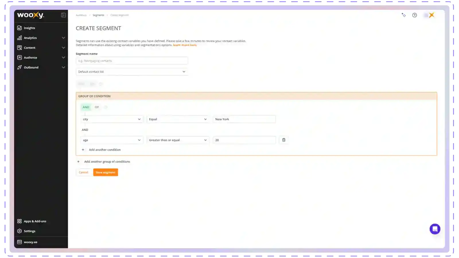 - Segments are formed from user data provided via the API, manual entry, file import, or behavioral data collected by Wooxy.