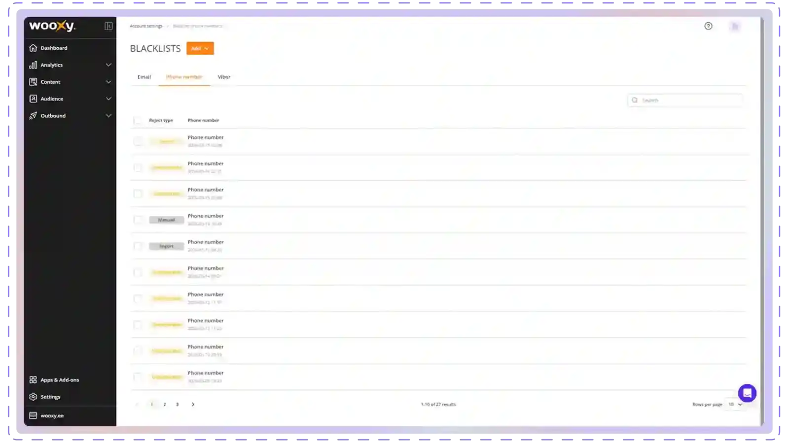 This section explains how to manage the Phone number blacklist, including adding and removing contacts. Management via API is also available; find detailed information here.