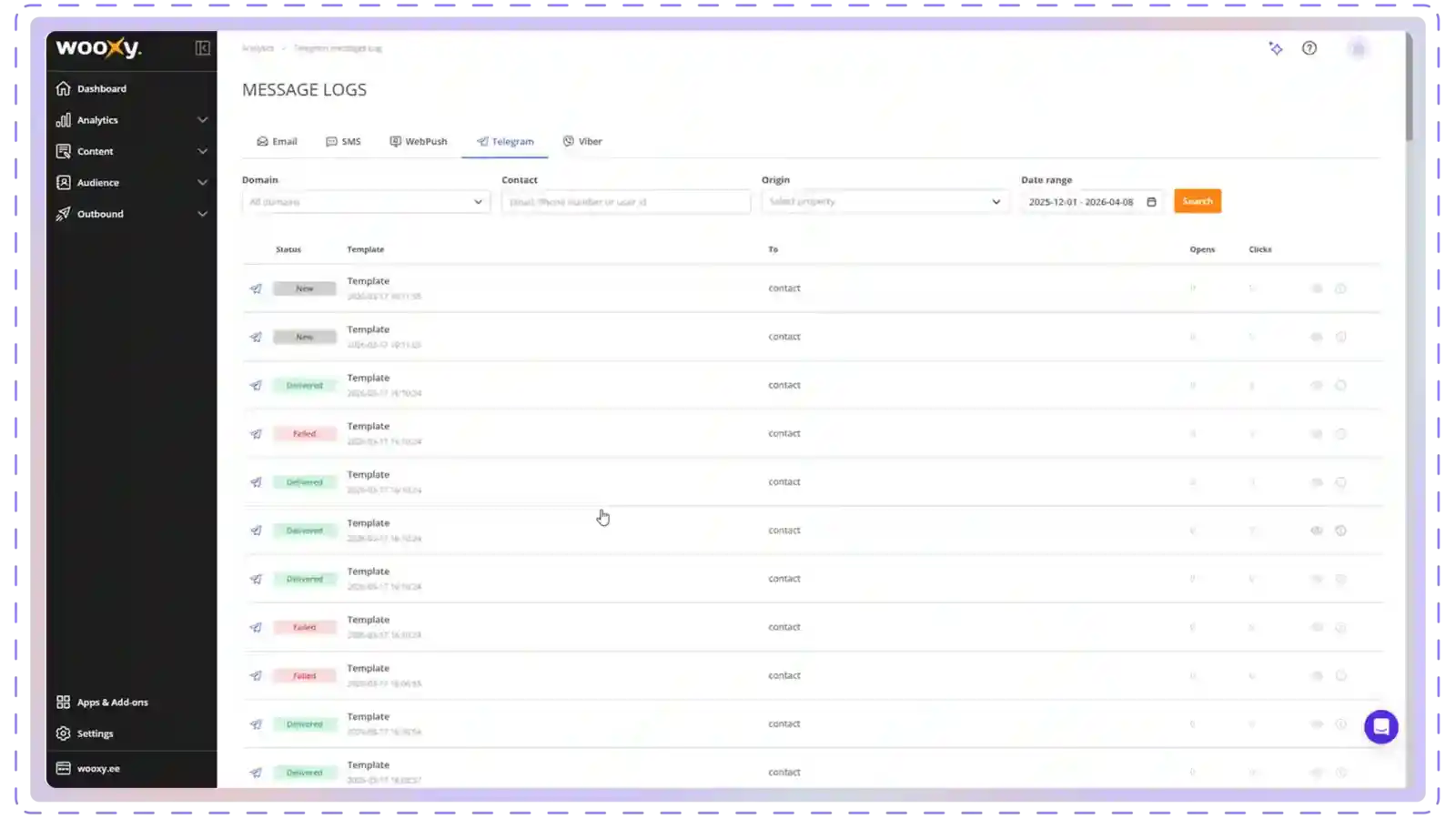- Status - the current delivery state (delivered, failed, or new).