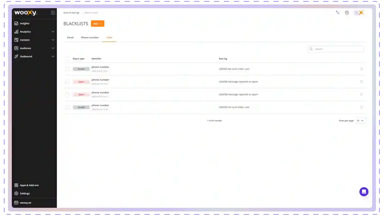 This section explains how to manage the Viber blacklist, including adding and removing contacts. Management via API is also available; find detailed information here.
