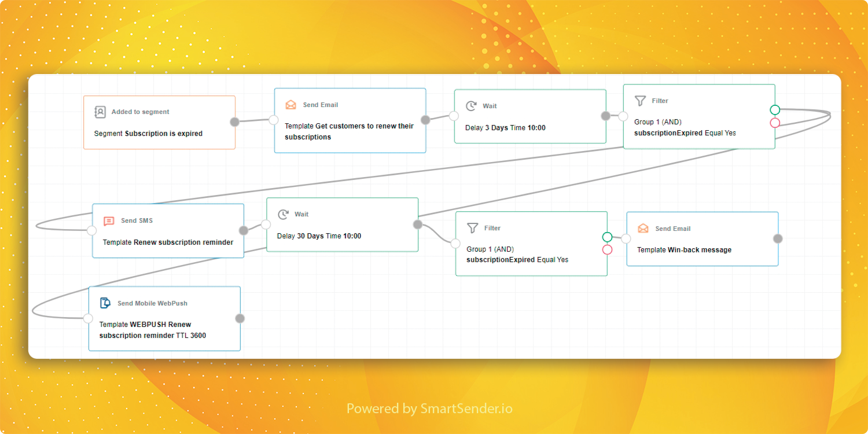 - Use automation software. With the Smartsender.io automation platform, you can create personalized win-back campaigns to reach out to your churned customers via email, SMS, web push, and telegram. The system allows a/b test your messages to understand which email performs better. Personalize your messages based on your churned customers’ behavior, get a detailed report of your campaign, and take action accordingly.