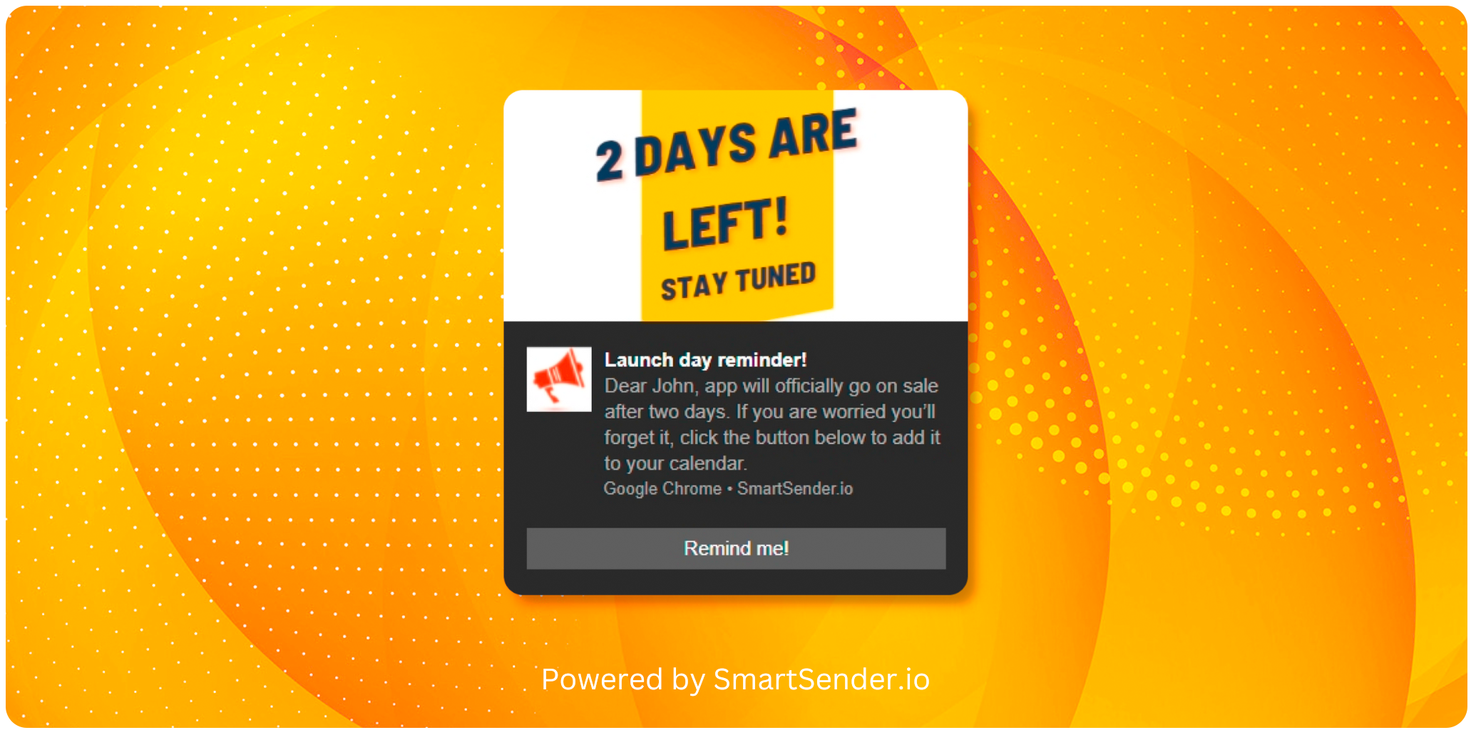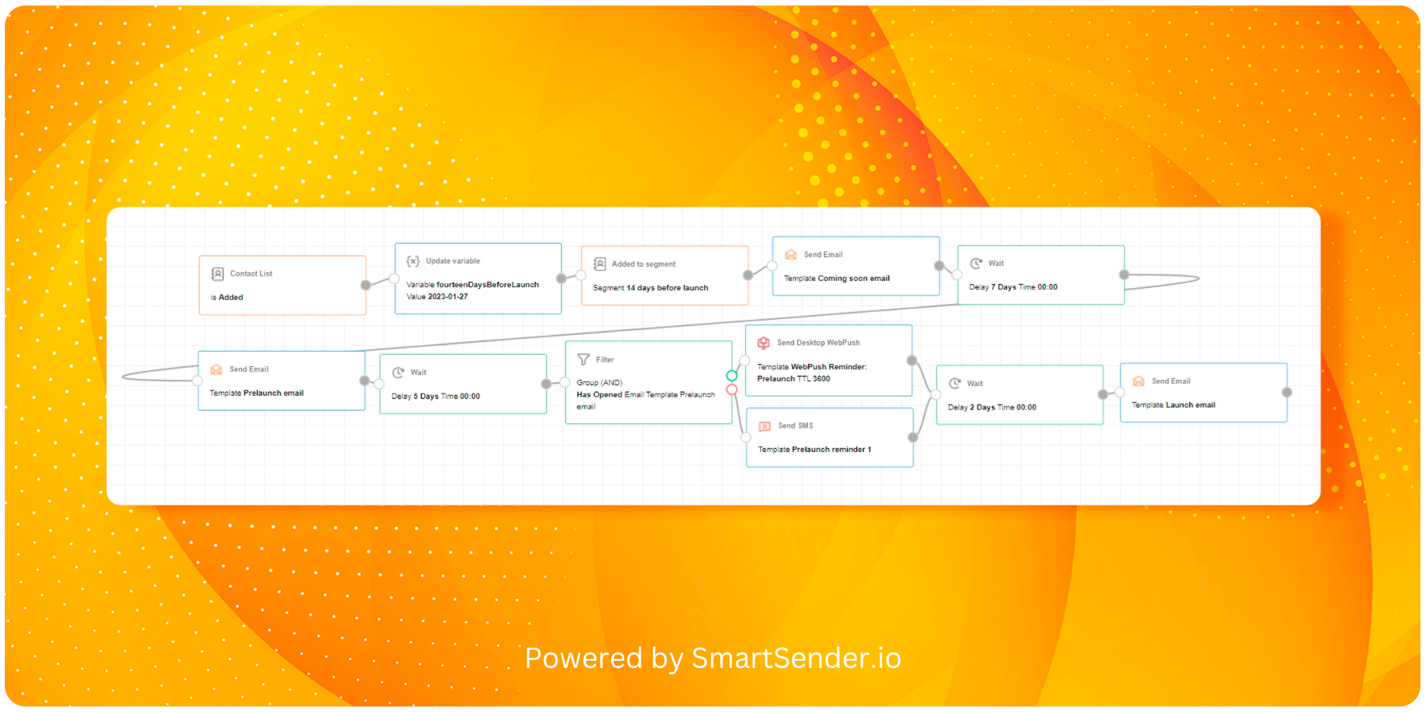 After it, the platform will wait five days and check whether the "Prelaunch" email is opened. If the answer is “Yes” the platform will send a Web push notification, reminding them that the product launch will happen after two days. Otherwise, if the answer is "No," the client will get an SMS reminder.