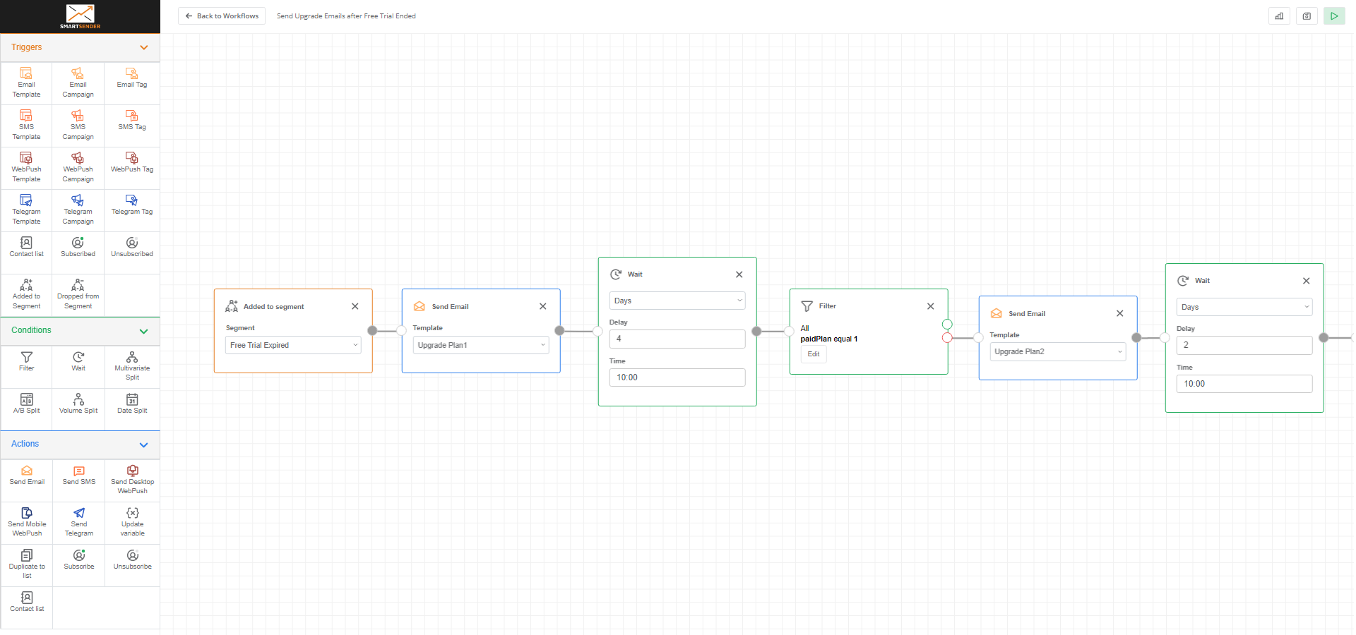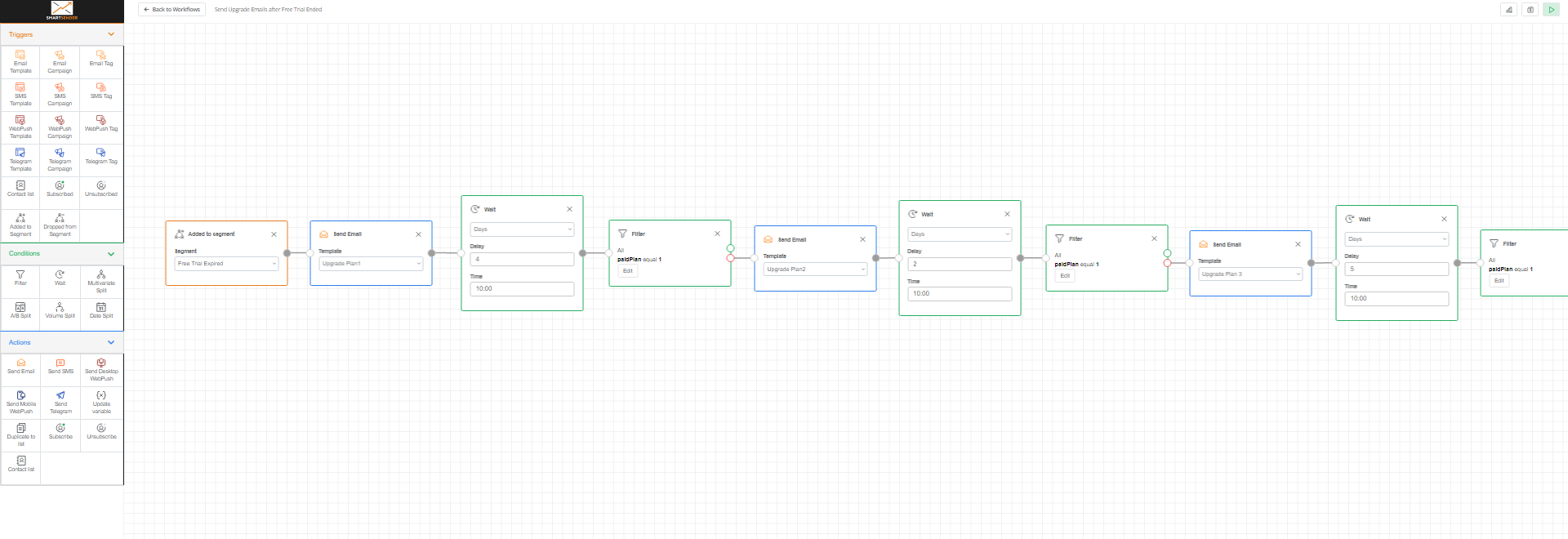 - Send the first email when the contact is added to the segment (1 week before a free trial is about to expire), letting the customer know that the free trial will expire soon.