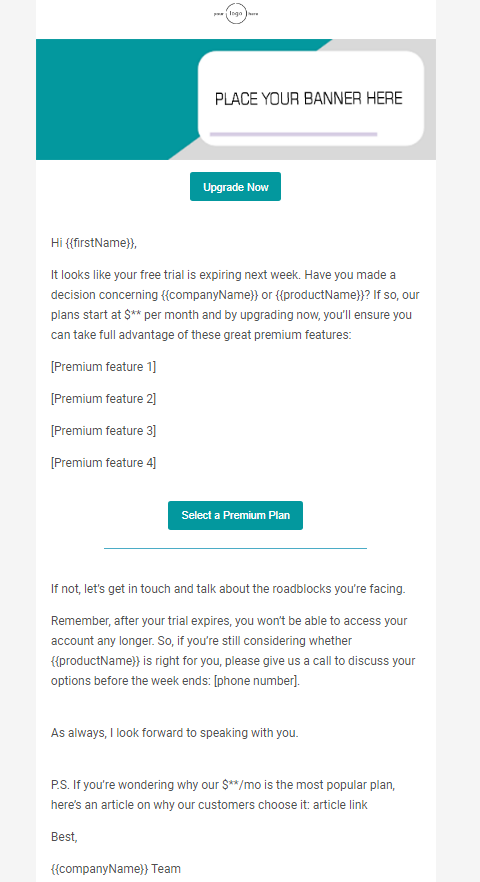 Emails promoting Plan Upgrade are crucial for product-led businesses driven by both free trial and ‘freemium’ models. They help convince prospects to convert and upgrade from free to paid accounts and to higher premium plans.