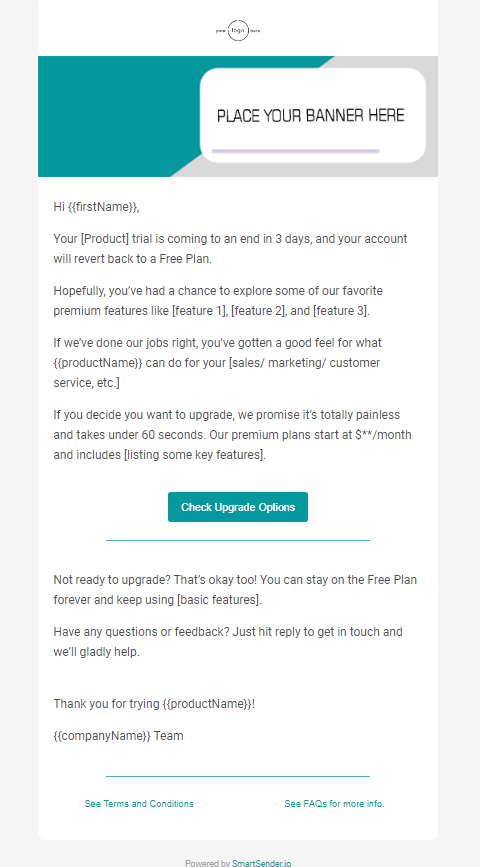 - Send the third email 24 hours before the expiration (2 days after the previous email), informing the customer to upgrade to continue to use.