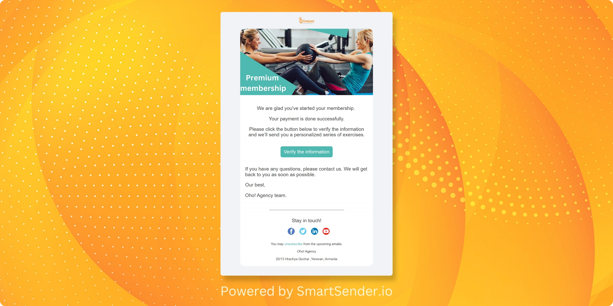 The email will be sent immediately after being added to the “paymentIsDone” segment. The contact will be added to this segment after making a payment. With this email, you’ll let your customers know that the payment was done successfully and will ask them to verify the information about themselves. One of the benefits of this template is the “Verify the information” button, which will take them back to their accounts. The other benefit is that you establish communication with your customer immediately after making a payment.