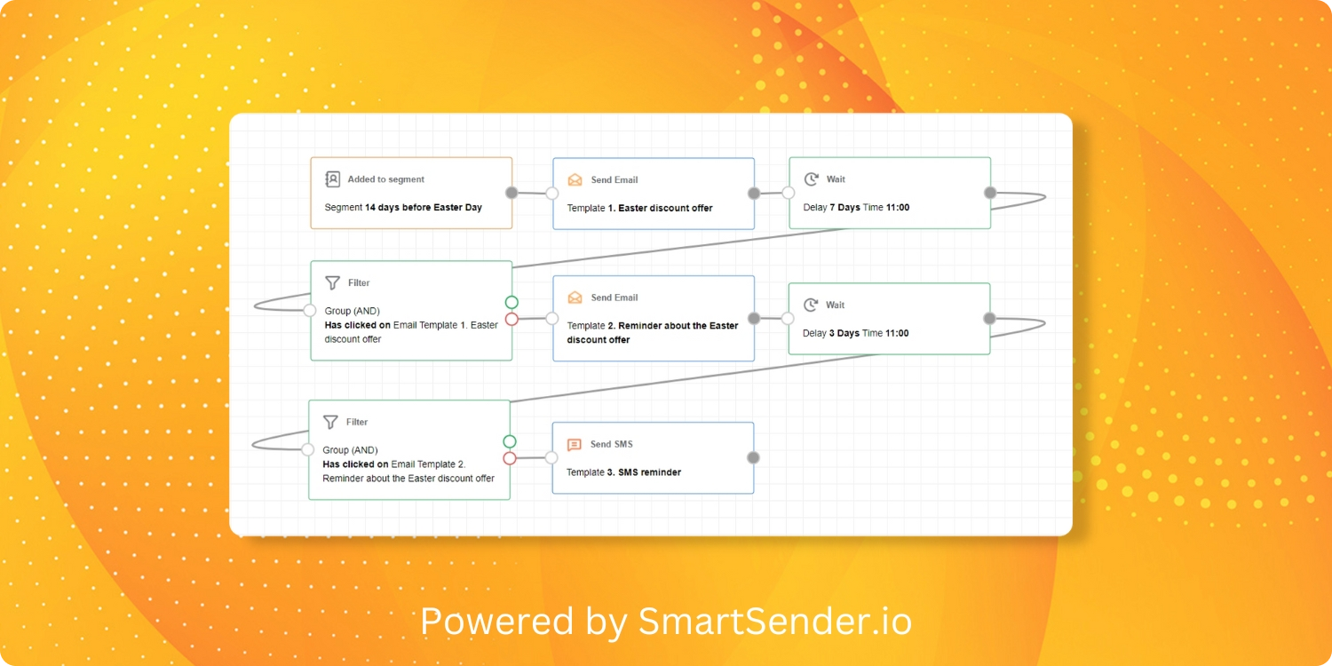 This workflow is drafted to help you launch an automated campaign with ready-to-use templates and respective segmentation. It starts 14 days before the Holiday. With the first email, your customers will receive a 20% discount for their next purchase. The system will then determine whether the customer claims the offering within the last seven days. If they still need to, they will receive an email reminder. Finally, they will receive an SMS reminder in three days.