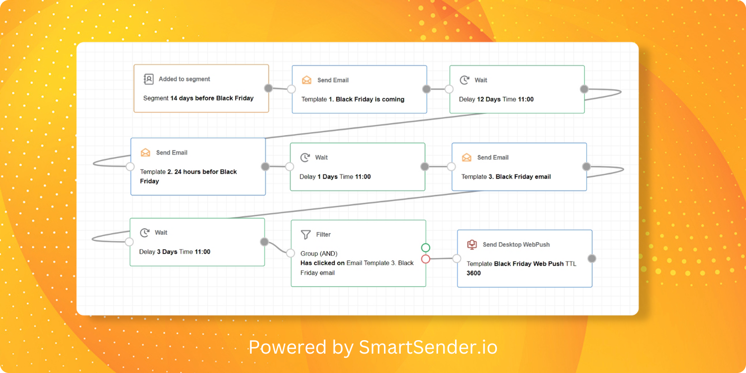 It starts with the "Added to segment" trigger. For example, if Black Friday is 14 days away, the contact will automatically be added to the segment. After that, your customer will receive an email template. Customers will be informed about the upcoming sale with the first email.