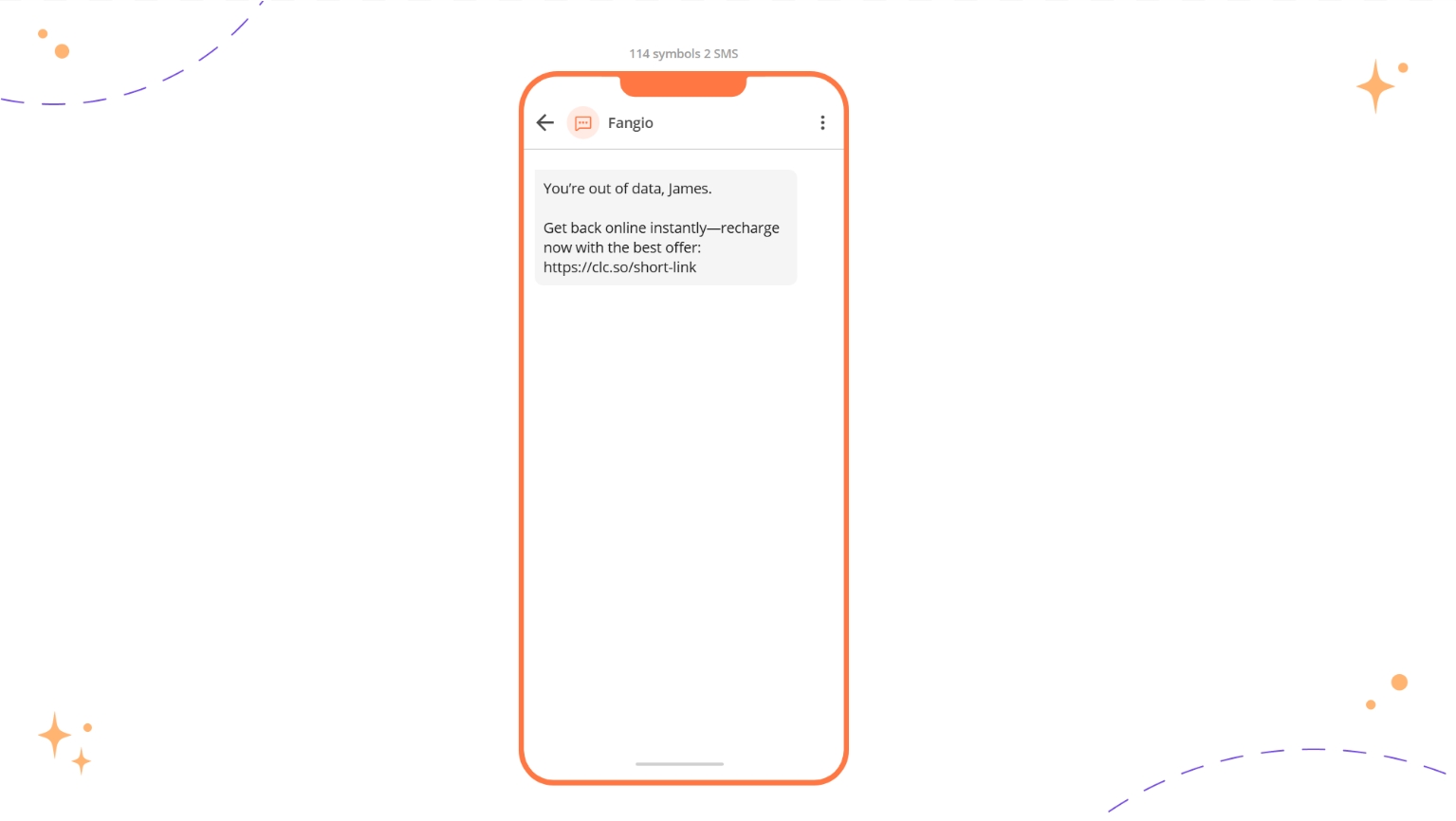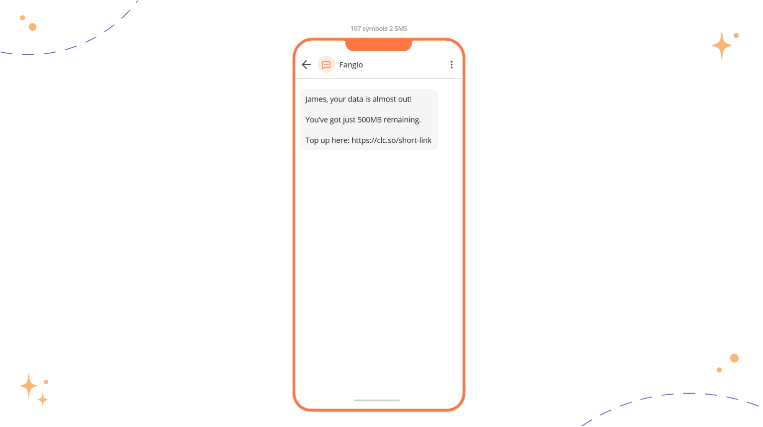 3 SMS reminders to encourage end telecom subscribers to replenish their internet data balance, structured to escalate in urgency. Each includes personalization and a clear call-to-action: