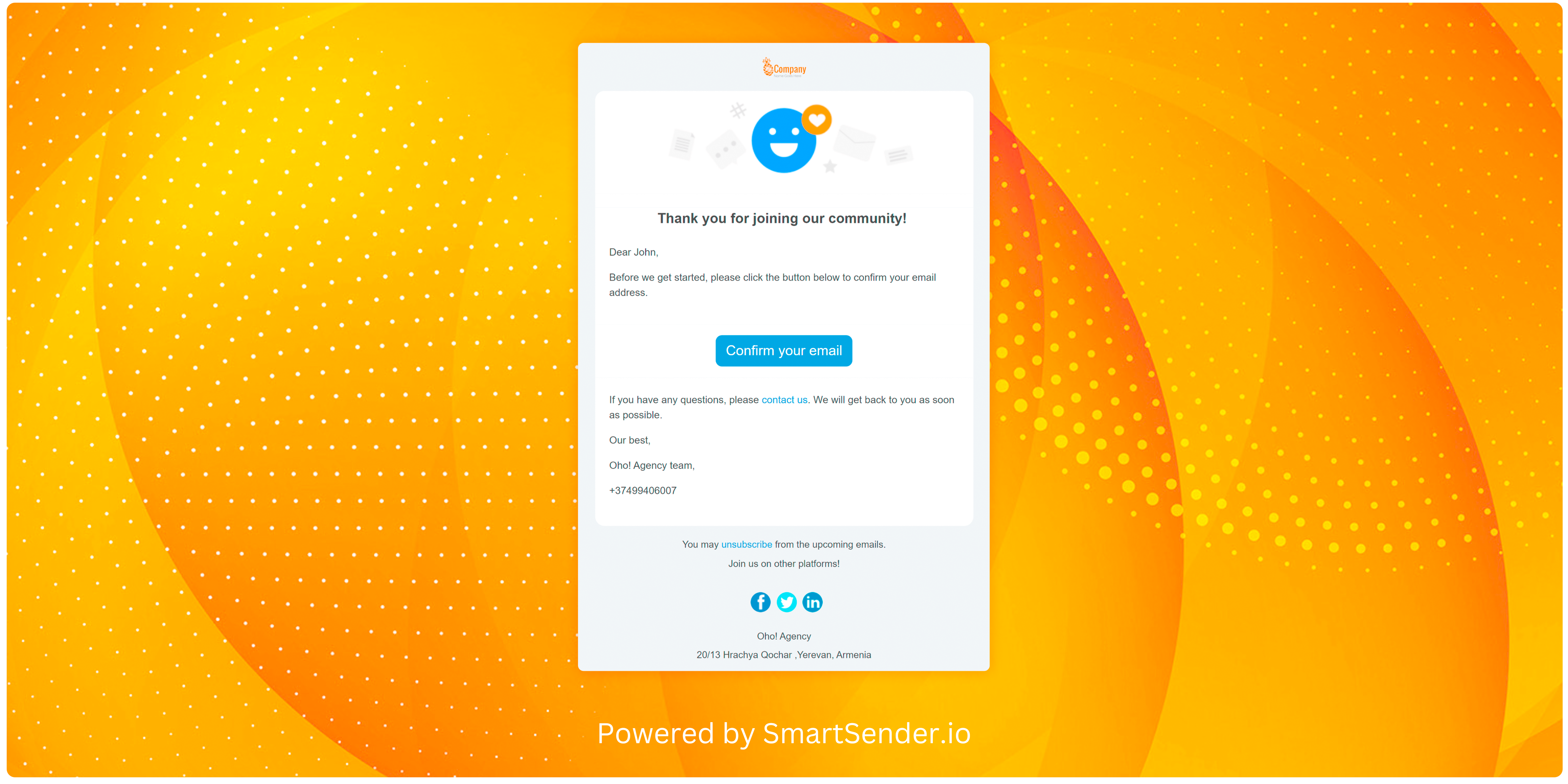 The second block is the email template. It will be sent following the event. This email is to ask your contact to confirm the email. It can also be used to welcome or to thank for registration.